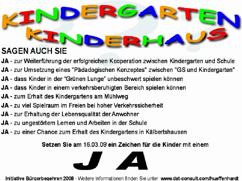 Hier erfahren Sie Wissenswertes über das "für und wieder" zum Thema Kinderhaus in Hüffenhardt welches auf dem Gelände der Grundschule errichtet werden sollte, während im bestehenden Kindergarten (Mühlweg) bereits seit > 2 Jahren erfolgreich die Kleinkinderbetreuung durchgeführt. Ein Vorteil - ausser die Nähe zwischen Grundschule und Kinderhaus - war aus den Gemeindeargumenten nicht erkennbar. Aber informieren Sie sich einfach hier selbst über das gesamte Thema.